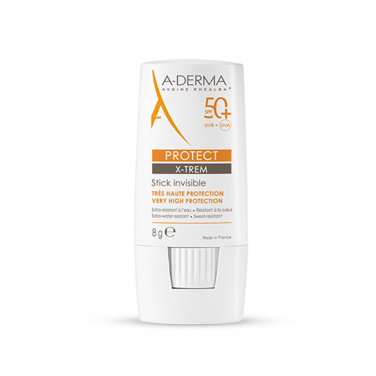 A-DERMA PROTECT X-TREM, stick invisível de proteção muito elevada SPF 50+, especialmente desenvolvido para as zonas frágeis localizadas (incluindo cicatrizes e tatuagens) expostas ao sol.