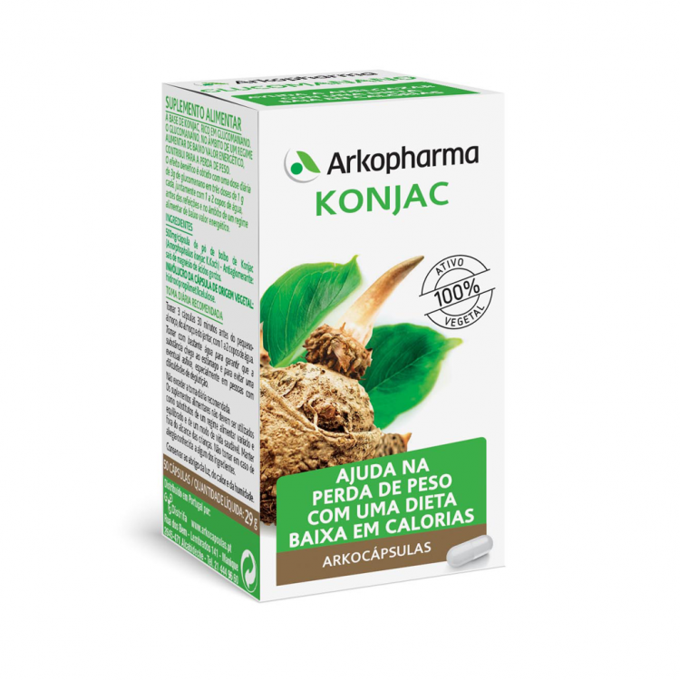 ARKOCÁPSULAS Konjac é um suplemento alimentar à base de Konjac, rico em Glucomanano. O Glucomanano, no âmbito de um regime alimentar de baixo valor energético, contribui para a perda de peso. O efeito benéfico é obtido com uma dose diária de 3g de glucomanano em três doses de 1g cada, juntamanete com 1 a 2 copos de água, antes das refeições e no âmbito de um regime alimentar de baixo valor energético.