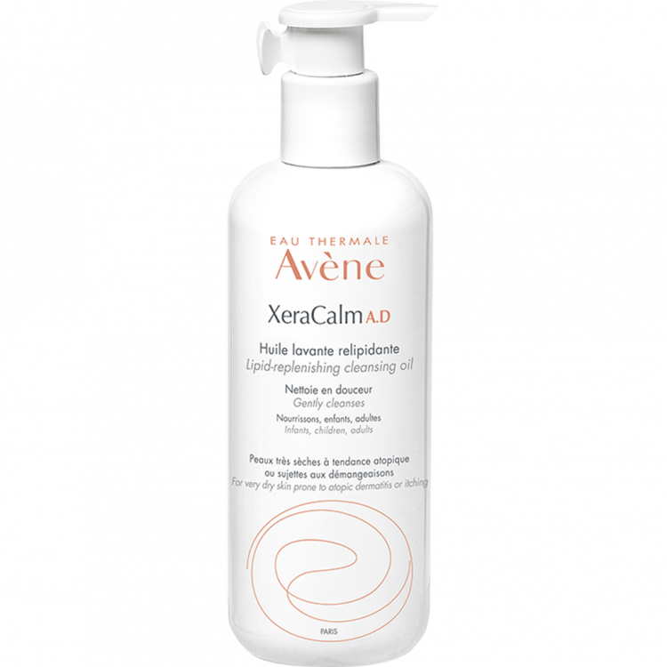 XeraCalm A.D Óleo de limpeza relipidante está especificamente formulado para a pele seca sensível, para bebés, crianças e adultos: de tendência atópica, com prurido e irritações da pele naturalmente seca. SEM SABÃO, SEM PERFUME, pH fisiológico.
