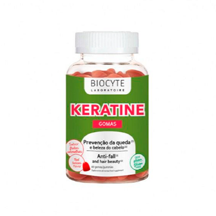 Biocyte Keratine Gomas é um suplemento alimentar em forma de gomas com delicioso sabor a frutos vermelhos que ajuda a prevenir a queda do cabelo, reforçando a sua beleza.