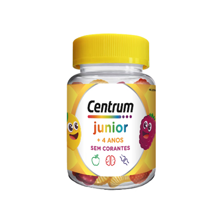 Contém a dose diária de Vitaminas e Minerais em formato divertido para as crianças com sabor a cereja, laranja e morango/ framboesa. Centrum júnior Gummies apoia o crescimento e desenvolvimento saudável com nutrientes chave como a Vitamina D e o Zinco. Fórmula especialmente concebida com: Vitamina C, D e Zinco para apoiar o sistema imunitário. A Vitamina D é necessária para o crescimento e desenvolvimento normal dos ossos das crianças. O iodo contribui para uma normal função cognitiva. Apoia o bem-estar geral das crianças a partir dos 4 anos. Um suplemento alimentar que complementa a dieta infantil. Disponível em embalagens de 30 gomas.