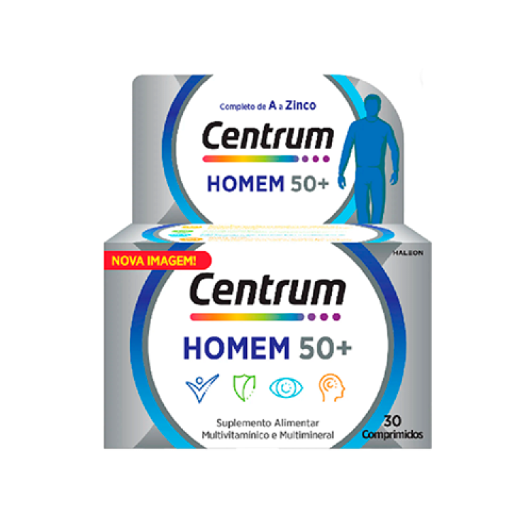 As necessidades de vitaminas e minerais dos homens são diferentes das necessidades das mulheres, mesmo depois dos 50 anos. Centrum Homem 50+ contém uma fórmula especificamente equilibrada com quantidades reforçadas de vitaminas e minerais que ajudam a satisfazer as necessidades específicas de homens com mais de 50 anos. - Fórmula com elevado teor de vitamina D que contribui para níveis normais de cálcio no sangue e para a manutenção de ossos normais. - Com Ácido Pantoténico que contribui para um desempenho mental normal, e com Zinco e Ferro que contribuem para uma normal função cognitiva. - Disponível na forma de comprimidos, em embalagens de 30 e 90 comprimidos. - Isento de glúten e sem açúcares.