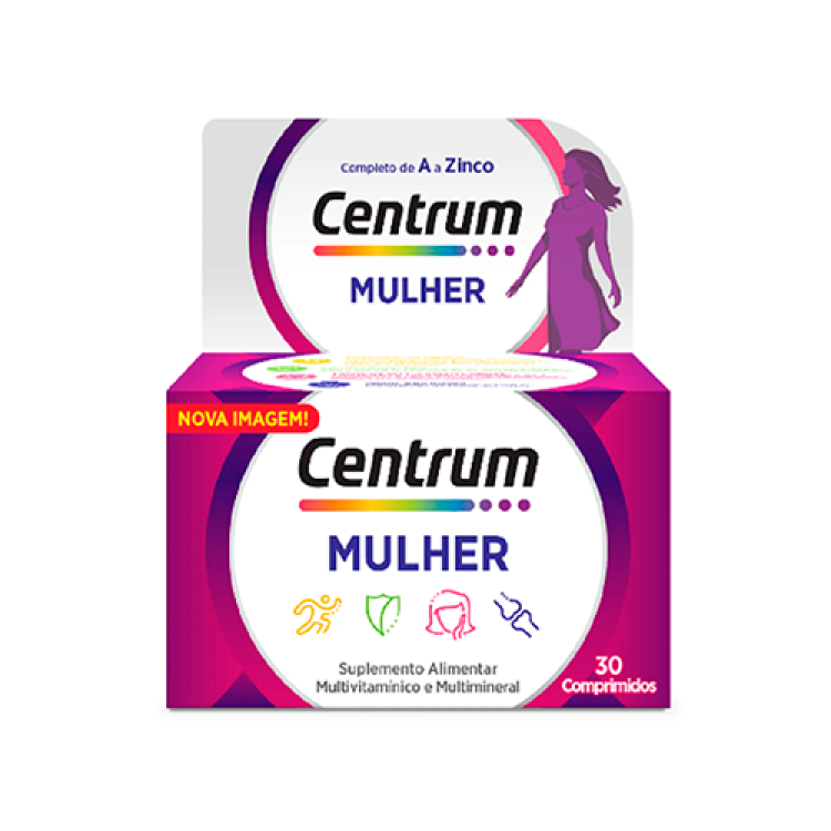 As necessidades nutricionais de vitaminas e minerais das mulheres são diferentes das dos homens. Centrum Mulher é um suplemento alimentar com vitaminas e minerais para mulheres a partir dos 18 anos. Com uma fórmula especificamente equilibrada com quantidades reforçadas de vitaminas e minerais que ajudam a satisfazer as necessidades específicas das mulheres. - Fórmula com elevado teor de Vitamina D que contribui para níveis normais de cálcio no sangue e para a manutenção de ossos normais. - Com Ferro para compensar as perdas menstruais, com Biotina e Zinco que contribuem para a manutenção da pele e do cabelo em condições normais e com Selénio e Zinco que contribuem para a manutenção de unhas normais. - Disponível na forma de comprimidos, em embalagens de 30 e 90 comprimidos. - Isento de glúten e sem açúcares.