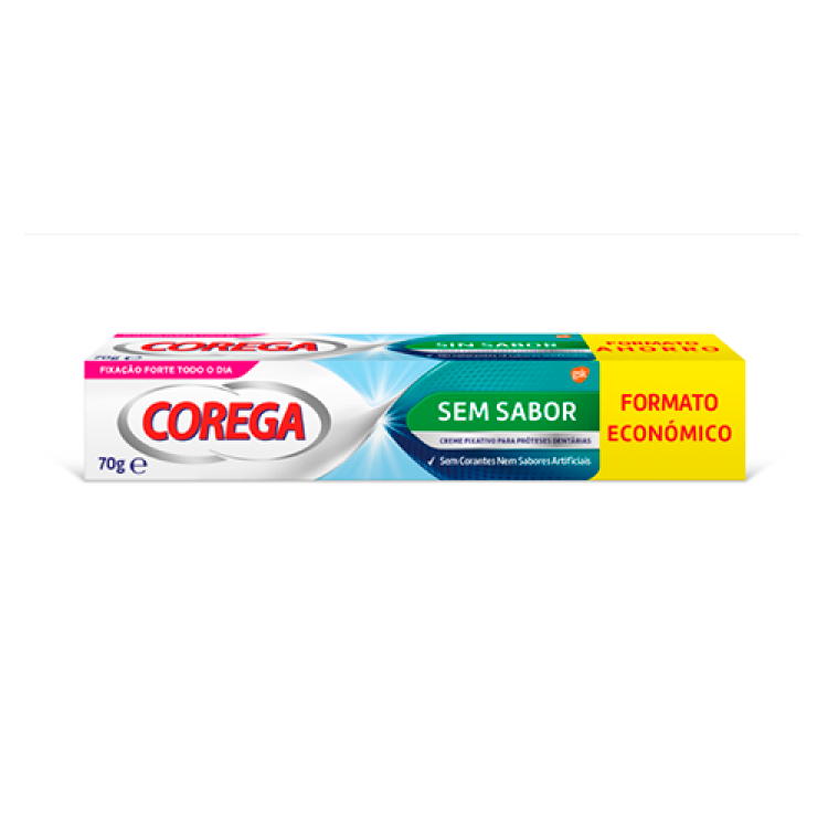Corega Sem Sabor proporciona fixação forte todo o dia e apresenta um sabor neutro que não altera o sabor dos alimentos.