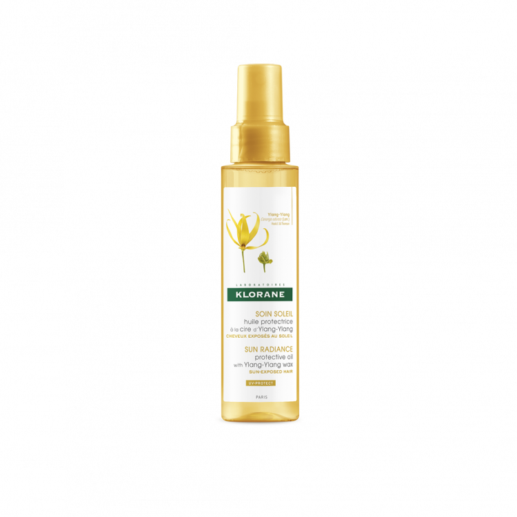 Klorane Capilar Óleo Ylang Ylang para cabelos expostos ao sol protege a fibra capilar e a cor do cabelo. Nutre em profundidade