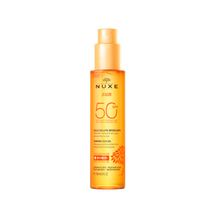 Nuxe Sun Óleo Bronzeador SPF50 : proteção celular antienvelhecimento reforçada Este óleo solar bronzeador FPS50 protege eficazmente o rosto e o corpo dos raios solares, evitando o aparecimento de manchas escuras. Com um exclusivo complexo filtrante patenteado, proporciona proteção UVA/UVB de amplo espectro e previne o fotoenvelhecimento prematuro da pele graças à sua eficácia reforçada contra os UVA.