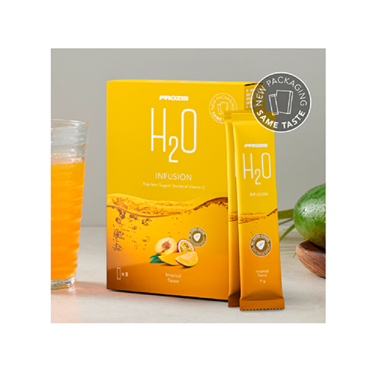 A sua hidratação favorita, enriquecida com vitamina C Qualquer altura é boa para beber água. Mas água com um sabor especial sabe sempre melhor, por isso, é natural que beba mais! Dê um toque frutado à sua água e desfrute da sua rotina diária com a melhor H2O. Uma alternativa divertida e deliciosa! Escolha o seu sabor favorito, enriquecido com vitamina C. Destinado a: - Pessoas ativas; - Atletas; - Pessoas que se preocupam com a sua saúde; - Idosos. A vitamina C tem um papel importante: - Na formação de colagénio para o normal funcionamento da pele; - Na manutenção do normal funcionamento do sistema imunitário; - Na formação de colagénio para funcionamento normal dos vasos sanguíneos; - No metabolismo normal de produção de energia; - Na normal formação de colagénio para normal funcionamento de ossos e cartilagem; - Na formação normal de colagénio para o normal funcionamento de gengivas e dentes; - No normal funcionamento do sistema nervoso e na normal função psicológica; - Na proteção das células contra as oxidações indesejáveis; - Na redução do cansaço e da fadiga; - Na regeneração da forma reduzida da vitamina E. E porque não beber esta água saudável e revigorante em festas, piqueniques e outras ocasiões especiais? É uma ótima alternativa às bebidas açucaradas nas festas das crianças! Ao contrário de outras bebidas solúveis em pó, a Prozis H2O, quando dissolvida em 1,5 L de água, tem 0 g de açúcares! Sabor tropical.