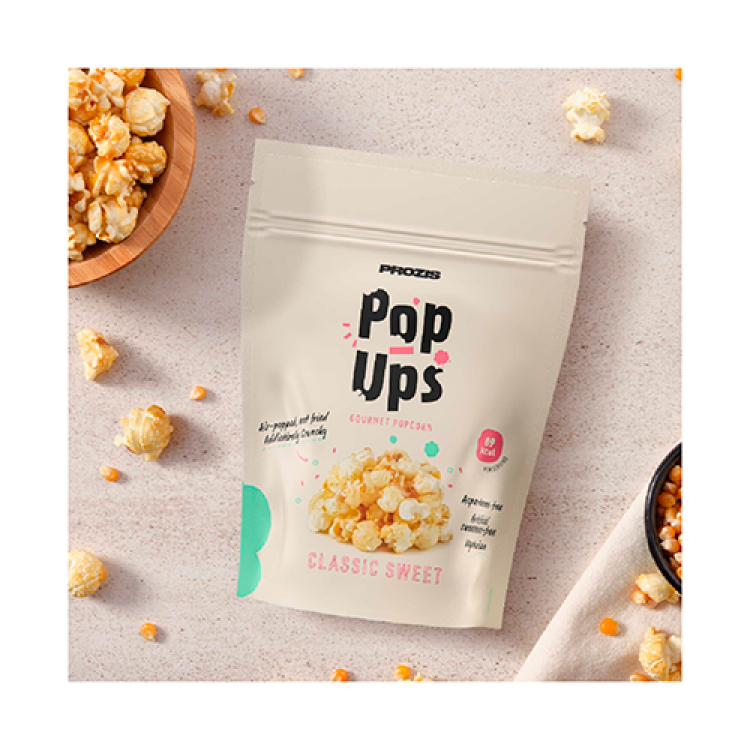 Experimente as Prozis Pop-Ups, um novo conceito gourmet para um clássico, que dá tudo por tudo quando se trata de sabor. Esperam-lhe tentações ricas e deliciosas, com açúcar verdadeiro e sabores que contrastam lindamente, equilibrados na perfeição. As Prozis Pop-Ups são feitas apenas com os melhores ingredientes e produzidas com o maior cuidado. Tudo começa com grãos de milho mushroom (cogumelo) que lhes dão a textura certa e uma forma arredondada agradável. Assim que o milho acaba de rebentar, toma um banho de imersão relaxante em caramelo requintado antes de lhe serem acrescentados os toques finais ao sabor. Provar é acreditar, experimentar é querer mais. Nos filmes e na vida real, um clássico é sempre um clássico, e estas Pipocas Clássicas Doces vão ser a estrela das suas noites de cinema. Milho leve e acabado de rebentar que produz pipocas viciantes, crocantes e deliciosas para algo doce, fofo e decadente. As Pop-Ups da Prozis são uma tentação açucarada à qual é impossível resistir. Por outro lado, as pipocas não pesam muito. Um pacote destas Pop-Ups contém 4 porções (21 g) com menos de 89 calorias cada uma. Isto faz com que seja perfeitamente possível adicionar as Pop-Ups ao seu modo de vida saudável e à sua dieta variada e equilibrada. - Sabores incríveis; - Os melhores ingredientes; - Vegetariano; - Rebentadas em ar quente, não fritas; - 89 kcal por porção (21 g). Sem: - Aspartame; - Edulcorantes Artificiais; - Aromas Artificiais; - Corantes; - Conservantes; - Óleo de Palma.