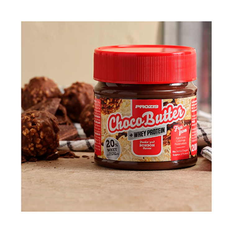 Choco Butter with Proteína Whey é simplesmente a opção fit mais cremosa e irresistível que irá elevar o seu pequeno-almoço e os seus snacks. Agora, pode espalhar esta combinação deliciosa em qualquer altura, confiante de que está a fazer uma escolha muito mais consciente! - Com apenas 7,7 g de Açúcares* - Com 21 g de proteína* - Com Maltitol - Com Proteína Whey *por 100 g Há algo melhor do que um creme de barrar de bombom sobre a sua fatia de pão? Saboreie esta deliciosa tentação e torne as suas pausas para snacks em momentos inesquecíveis. Comparado a um creme de barrar com sabor a chocolate, o Bombom Choco Butter da Prozis é uma melhor fonte de proteína. - Com Baixo teor de sal; - Com adição de proteína whey; - Fonte de proteína; - Sem óleo de palma; - Vegetariano; - Sem aspartame; - Sem corantes; - Sem conservantes; - Sem OGM; - Sem açúcares adicionados (Contém açúcares naturalmente presentes). Uma Opção doce e mais saudável para todos. O consumo de alimentos com maltitol ao invés de açúcar contribui para a manutenção da mineralização dos dentes.