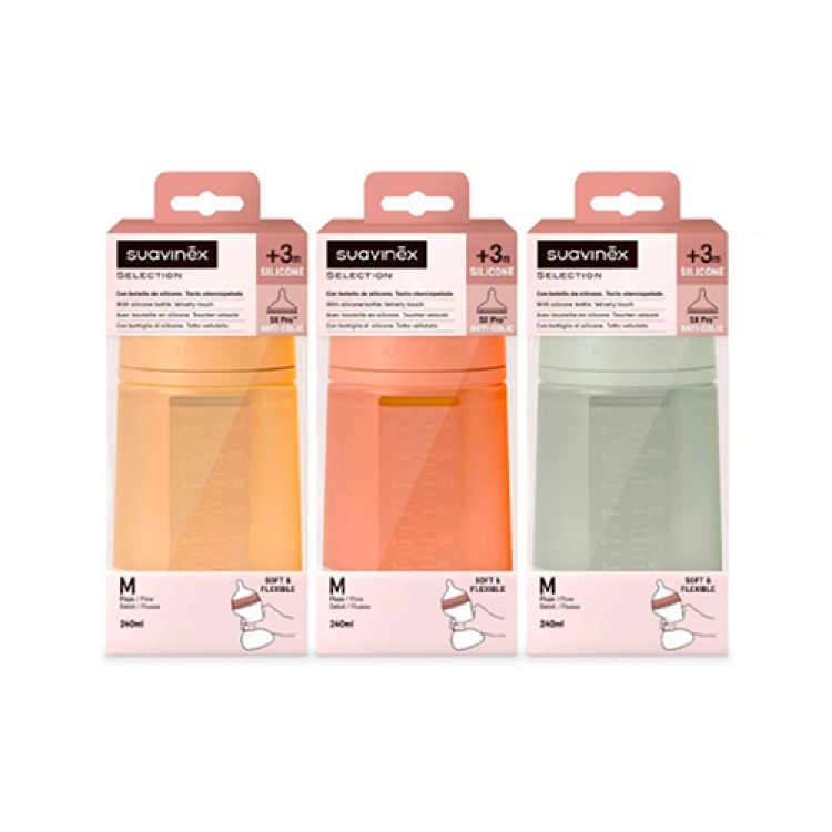 É um biberão anti-cólicas de silicone macio e fluxo médio, indicado para bebés a partir dos 3 meses. Flexível e macio. O interior do biberão foi submetido a um tratamento sem aditivos que minimiza a adesão de partículas e restos de sujidade. Fluxo médio. Ideal para leite, sumos e papas líquidas.
