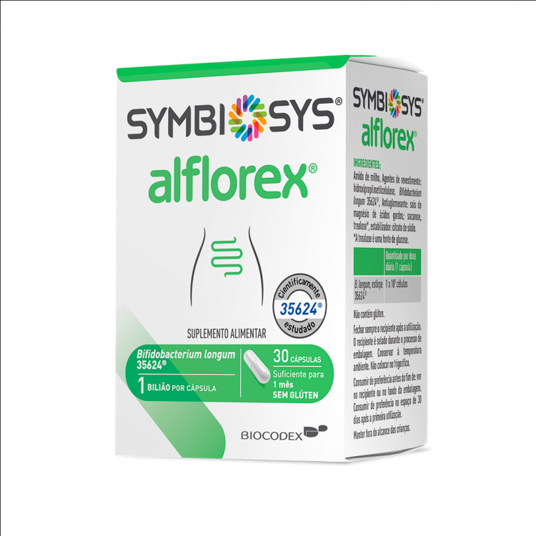 Alflorex® para a SII contém a estirpe B. longum 35624®. Foi demonstrado em estudos clínicos que a estirpe B. longum 35624® reduz os sintomas da Síndrome do Intestino Irritável, incluindo dor abdominal, inchaço, gases, diarreia e obstipação. Esta estirpe faz parte de uma família de bactérias transmitidas da mãe para o bebé no nascimento, a qual vive naturalmente no intestino humano. Alflorex® para a SII está isento de: gluten, lactose, produtos lácteos, conservantes, soja. É adequado para vegetarianos e para individuos numa dieta baixa em FODMAP.