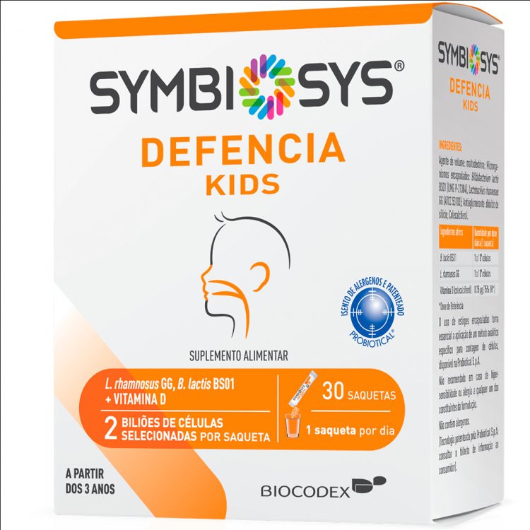 Symbiosys Defencia Kids é um suplemento alimentar para crianças com idade a partir dos 3 anos. Contém as estirpes de bactérias, Bifidobacterium lactis BS01 e Lactobacillus rhamnosus GG, contém ainda Vitamina D3 que contribui para o normal funcionamento do sistema imunitário nas crianças, especialmente durante os meses de inverno.