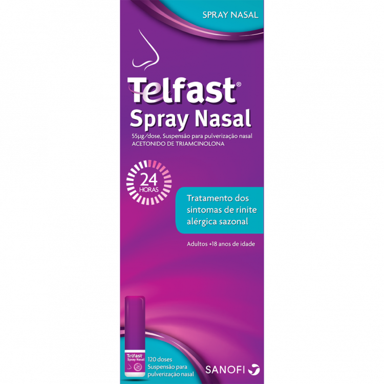 Telfast Spray Nasal é utilizado em adultos, no alívio dos sintomas associados com a febre dos fenos (rinite alérgica sazonal) tal como espirros, comichão, corrimento nasal ou comichão no nariz e nariz entupido. Contém como substância ativa acetonido de triamcinolona que pertence ao grupo dos medicamentos corticosteroides, o que significa que é um tipo de esteroide. Dose inicial recomendada: 220 µg (2 pulverização/narina, 1x/dia). Dose de manutenção: 110 µg (1 pulv./narina, 1x/dia). Para informações e precauções de utilização, consulte o folheto do produto. Diga Adeus às Alergias!