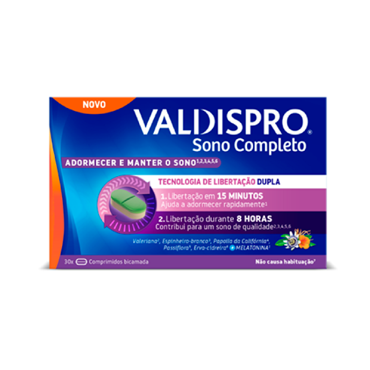 Suplemento alimentar com Melatonina que ajuda a adormecer, e Valeriana, Espinheiro-branco, Papoila da Califórnia, Passiflora e Erva-cidreira, que contribuem para um sono de qualidade sem interrupções.