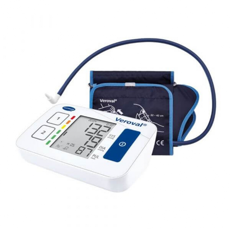 O Monitor de Pressão Arterial de Braço Superior Veroval é um produto que ajuda na detecção de arritmias. Tem um grande ecrã de visualização e um semáforo de visualização dos resultados. Tem um tamanho de manguito universal confortável com ajuste ergonómico e verificação do ajuste do manguito integrado.
