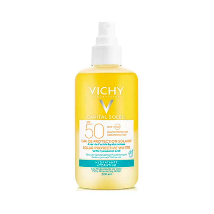 Água de proteção solar com Ácido Hialurónico e Água Mineralizante Vichy com FPS50. Ação hidratante.