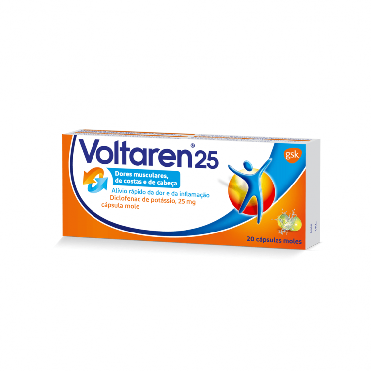 Voltaren 25 em cápsulas moles combate a dor na sua origem e diminui a inflamação. A fórmula concentrada de Voltaren cápsulas moles (25 mg) começa a atuar em 15 minutos, proporcionando um alívio da dor muscular e reumática, dores nas costas, dores menstruais, dor de cabeça e dor de dentes. Adultos e adolescentes acima dos 14 anos. Tome 1 cápsula mole aquando do aparecimento dos sintomas. Se necessário, continuar com 1 cápsula mole a cada 4 a 6 horas. Não tome mais de 3 cápsulas moles por dia. Engolir as cápsulas moles com água. Voltaren 25 Cápsulas moles (25mg) deverá ser utilizado durante curtos períodos de tempo, de até 5 dias para alívio da dor.